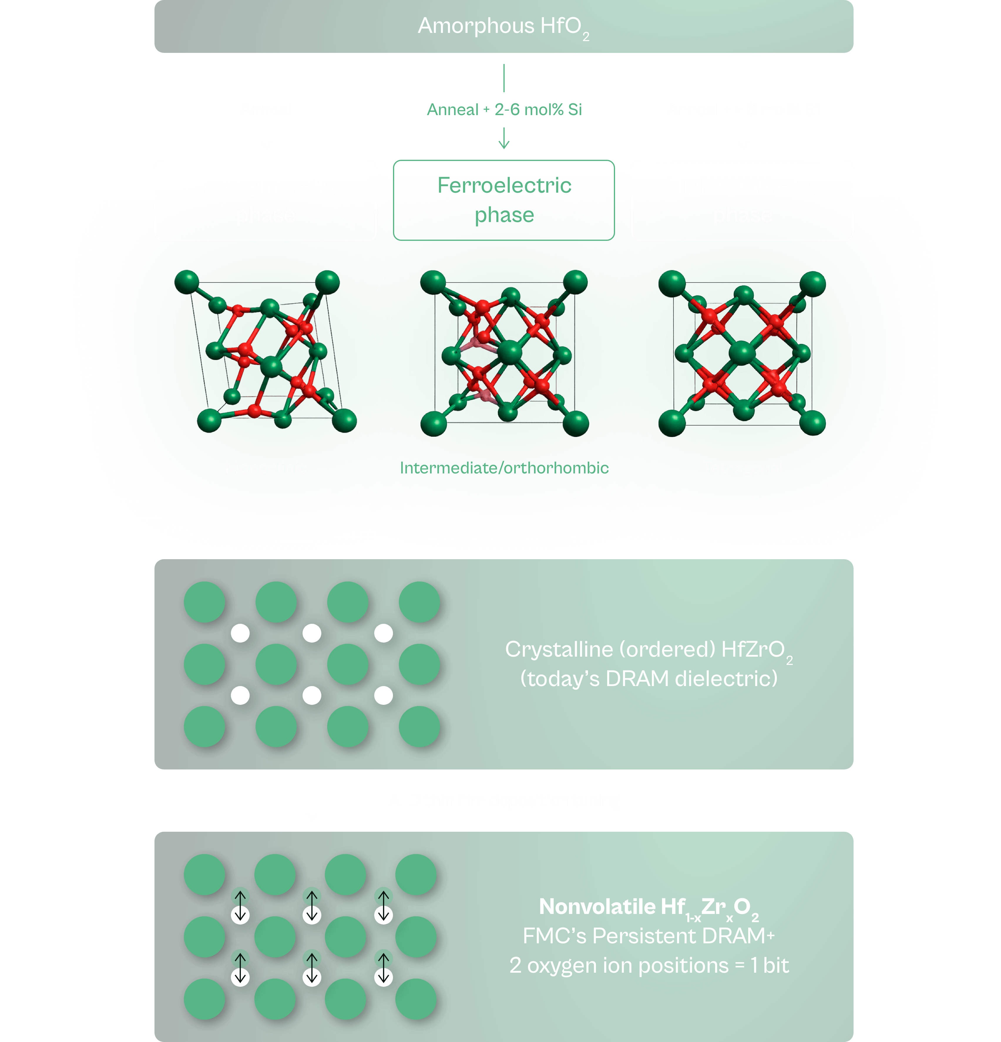 FMC has patented technology that leverages the ferroelectric properties of hafnium oxide. In its non-centrosymmetric orthorhombic crystal phase, the left ensemble of four red oxygen atoms in the unit cell exhibit two thermally stable sets of positions.